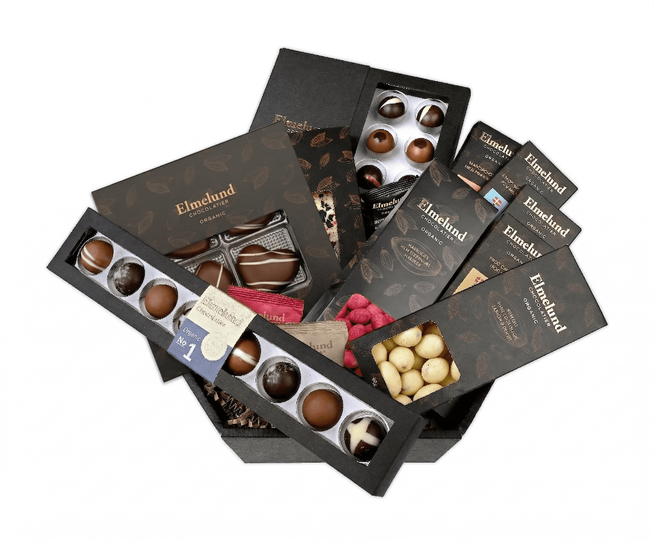 No. 1 Æske m. Fyldte Chokolader 80g, Gaveæske m. 16 stk Fyldte Chokolader m. Alkohol 160g, Hvid Chokolade m. Lakrids & Hindbær 80g, Marcipanhjerter Gaveæske 75g, Hvid Chokolade m. Karamel 45g, Mælkechokolade m. Fr. Nougat 45g, Mørk Chokolade m. Pebermynte Creme 45g, Mælkechokolade m. Salt Karamel creme 45g, Hassel Dragée m. Hindbær 90g, Mandel Dragée m. Lemon & Kokos 90g, små poser med Hassel Dragée m. hht lakrids og karamel